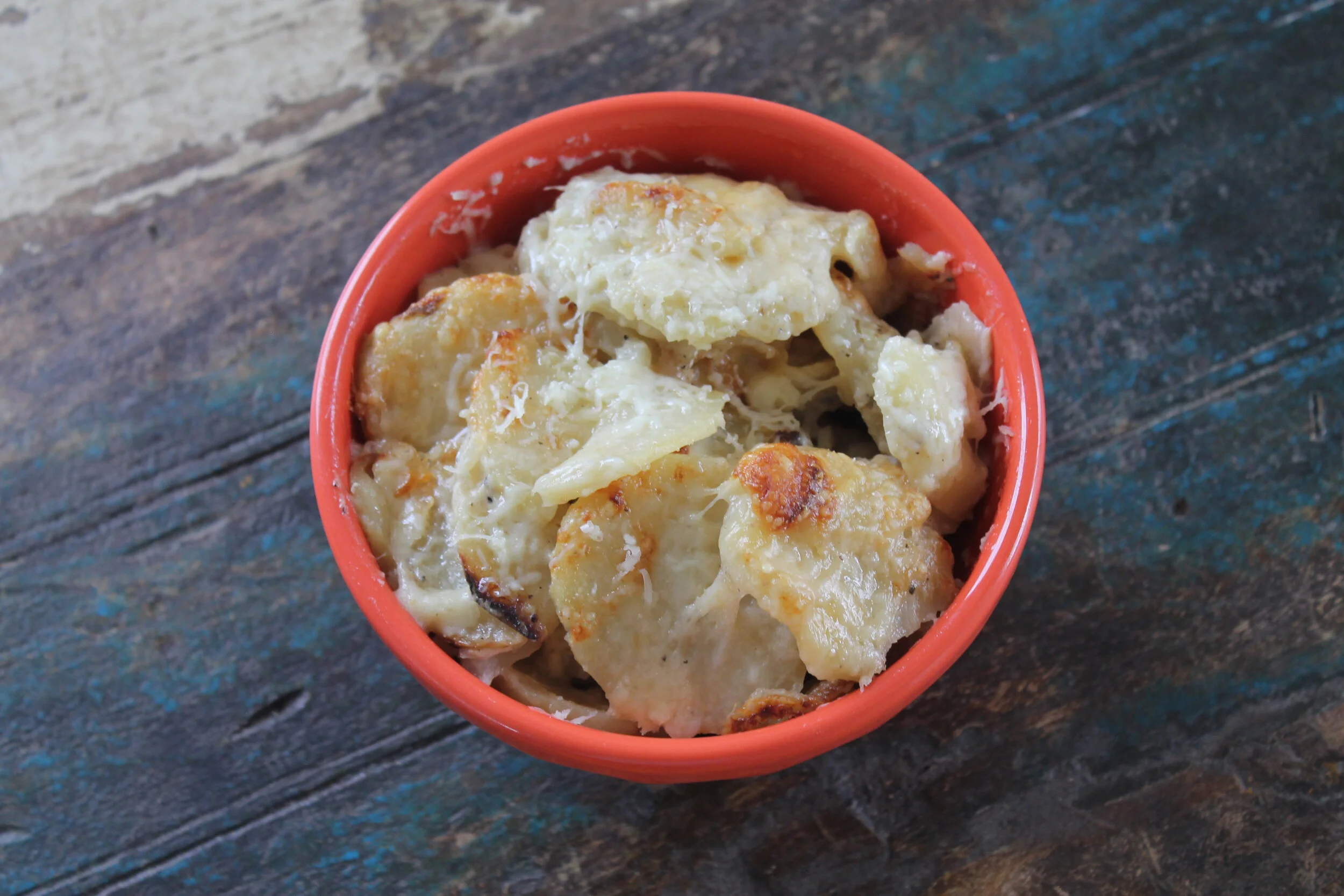 In a medium pan with about 1 tbsp olive oil, add garlic and shallots. After about 5 min, add cream and bring to a simmer. Cook down for about 12 min and then add 1 1/2 cups cheese, any herbs you are using, and then pour over your potatoes. Cover tightly with tin foil and bake on 350 for an 60min. Remove tin foil and top with remaining cheese and broil for another 10-15 until golden brown on top.